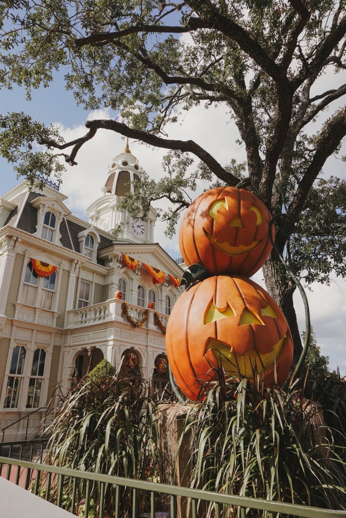 If you are someone who can’t obtain or afford tickets to the special event but still wants to take part in the Halloween fun then this article is for you! Let’s begin at the front of the park where you will be greeted by a large pumpkin photo spot. This is a bonus tip because you don’t even need park entry to get a photo here. Once you head in you will see the classic Mickey Pumpkins adorning the lamp posts, large stacks of Pumpkins with friendly faces, pumpkin people dressed as Cast Members, and colorful bunting lining the buildings.